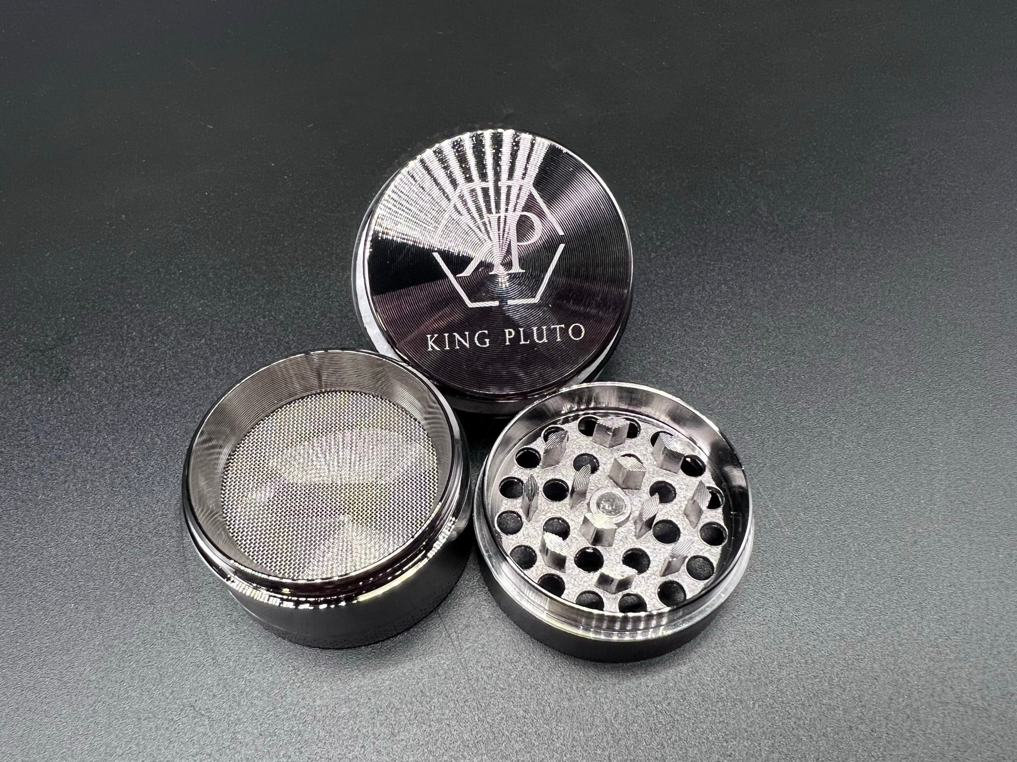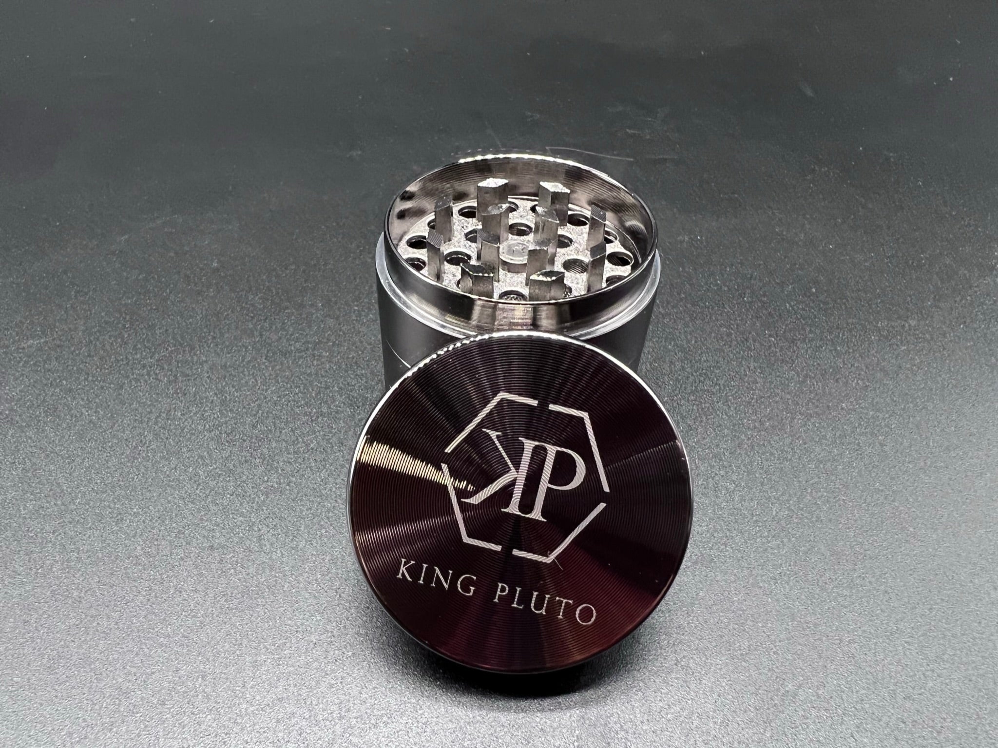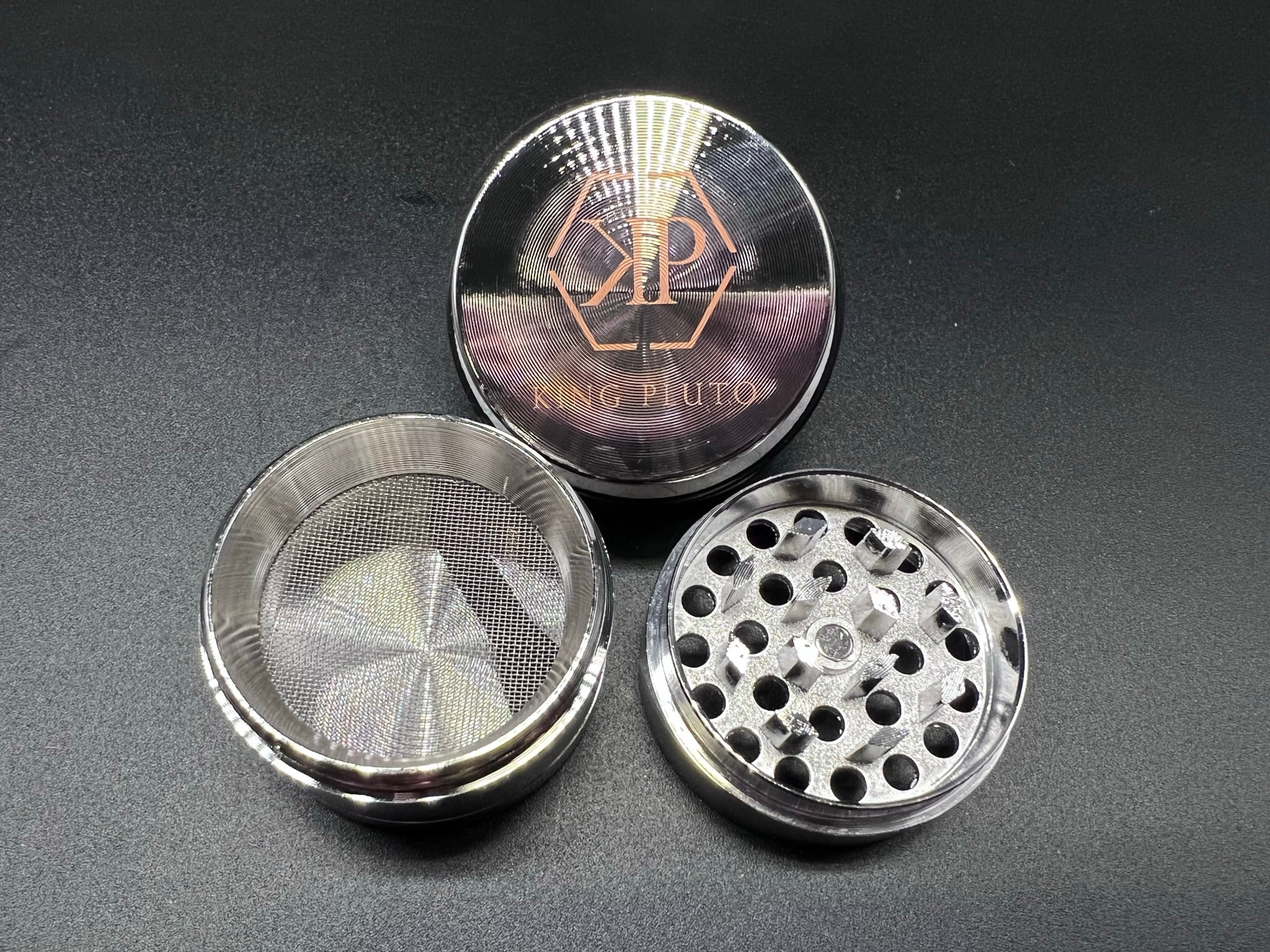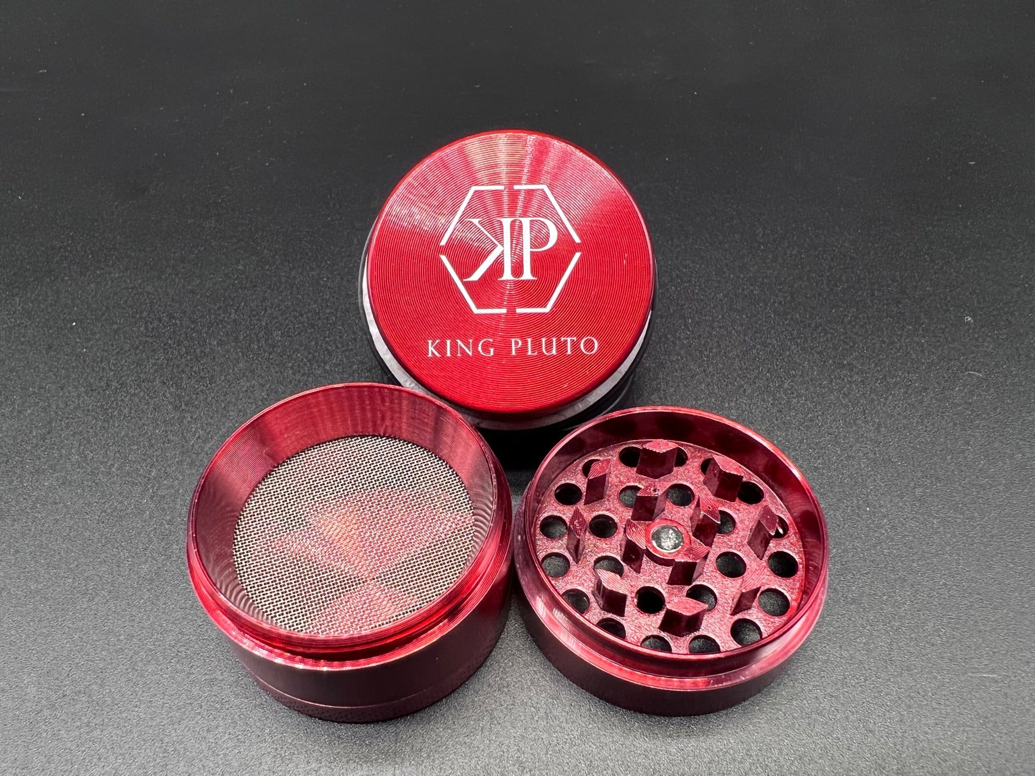 Heavy duty herb grinder with razor sharp teeth and magnetic lid to keep everything in place. All grinders come standard with a scraper to easily handle any herb filtered through the pollen screen.