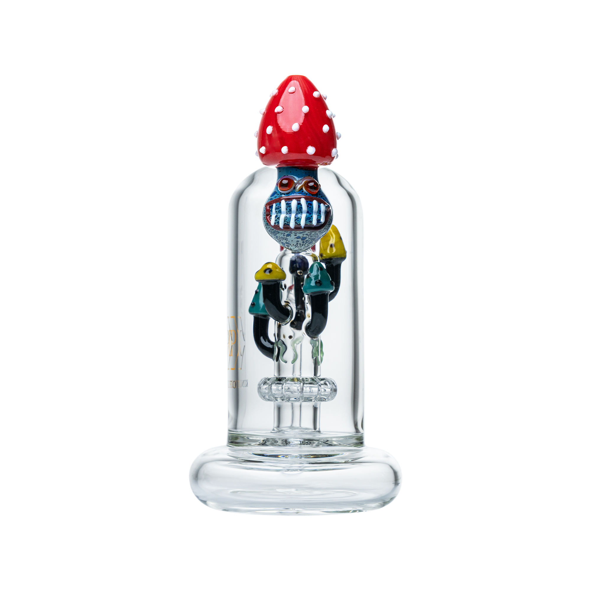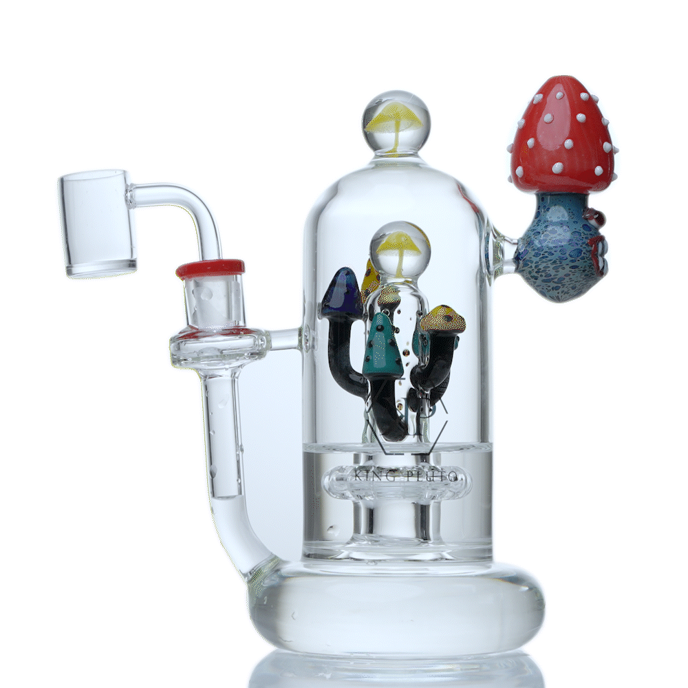This giant chambered rig with a manic "Mario mushroom" theme designed by KING PLUTO GLASS invites you to take the hit and be confident. Because every rip you take from this beautiful piece will produce a dense cloud while remaining smooth on the throat. With a whimsical and exquisitely detailed mushroom motif, this gorgeous bell shaped rig is crafted from thick and durable borosilicate glass.