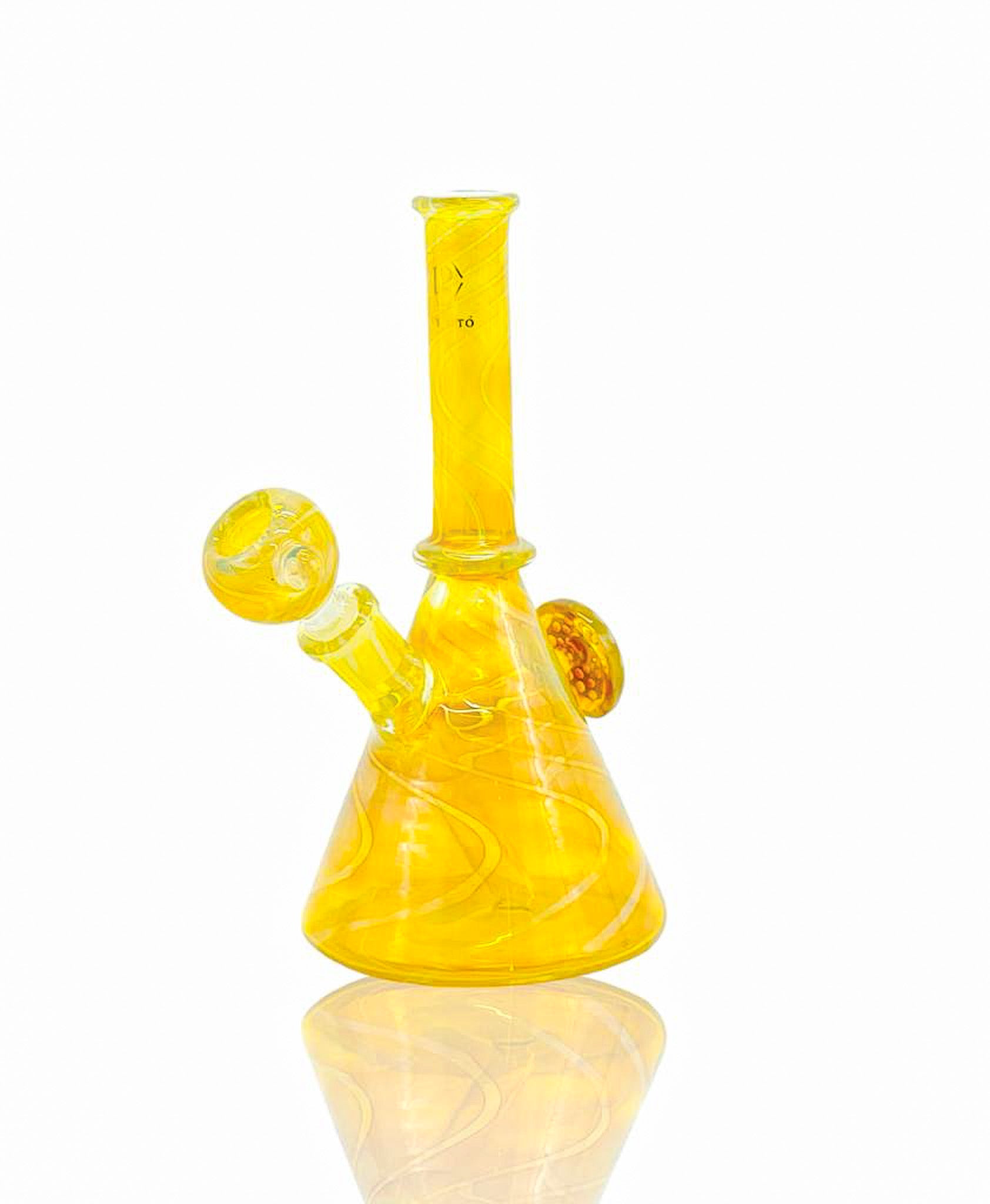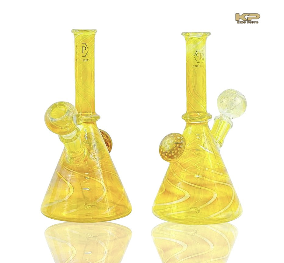 KING PLUTO GLASS Fusion Mini Beaker Waterpipe is beautifully designed with gold fume for a brilliant and colorful appearance. This classic beaker has a matching fumed bowl for smooth, classic diffusion while the beaker bottom chamber allows for more water volume and airflow. The straight neck and a honeycomb inspired opal will features its beauty to another level and will give your smoke a soothing experience. Don't miss out on this beauty!